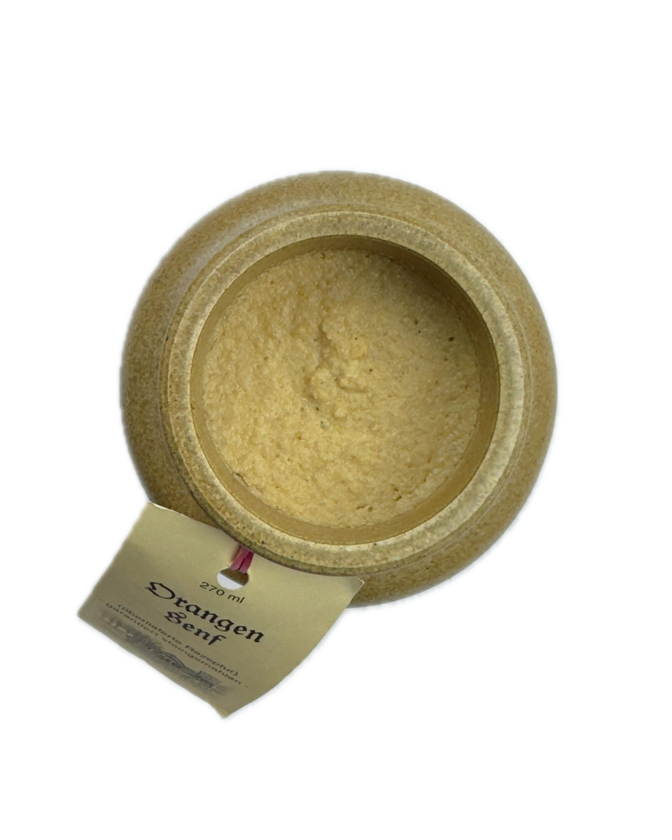 Unser Orangensenf vereint die pikante Schärfe von Senf mit der fruchtigen Frische der Orange. Ideal für Geflügel, Wild und kreative Dressings. Jetzt im Essgenuss Onlineshop entdecken.